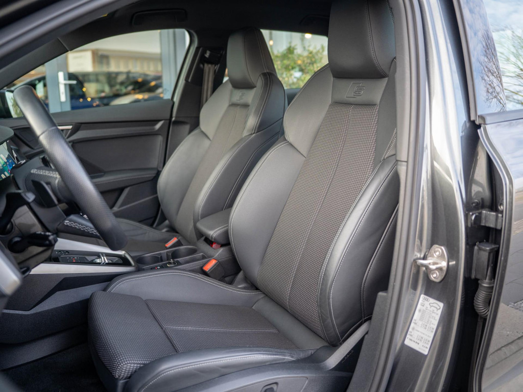Deze Audi A3 Limousine combineert het elegante sportback-design met de sportieve uitstraling van het dubbele S line-pakket. De S-line stoelen zijn mooi afgewerkt met half leder en stof.